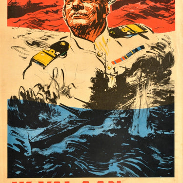 Original vintage World War Two military recruitment poster for the Dutch Navy relating to action in the Dutch East Indies - Ik val aan ... volgt mij dit sein waarmee schout bij nacht doorman de Japansche vloot tegemoet ging in 1942 - geldt ook voor u / I attack, follow me ... with these words Rear Admiral Doorman met the Japanese fleet in 1942 this command applies to you. Dramatic swirling sketch style image of Rear Admiral Doorman looking over naval ships in battle at sea with the red, white and blue flag of the Netherlands as the background. Karel Willem Frederik Marie Doorman (1889-1942) was a Dutch Rear Admiral killed in action during the Battle of the Java Sea defending the East Indies/Malay Barrier against an Imperial Japanese attack as part of the short-lived American British Dutch Australian Command (ABDACOM; 1942). Printed in England by James Haworth & Brother Ltd, London. Fair condition, folds, creasing, staining, tears, small paper losses on edges.