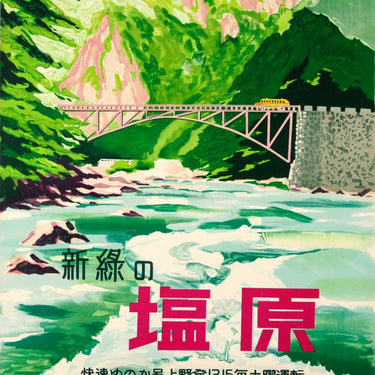 Original vintage travel poster for the featuring a scenic view of Shiobara Onsen hot spring town in Japanese Highlands with a yellow bus driving across a bridge over a fast flowing river through a green valley with trees on the side and the text in Japanese below. Published by Japan National State Railway. Good condition, small restored paper loss on margin, light staining, in bottom left corner, ink stamp on bottom right corner, backed on linen.