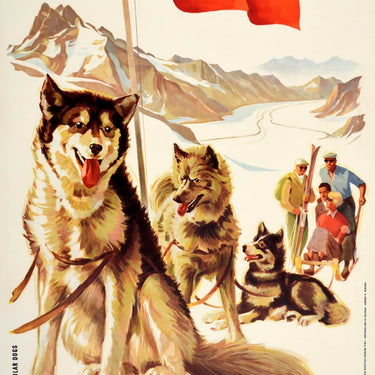 Original vintage winter sport and skiing travel poster - Bernese Oberland Switzerland Jungfraujoch Jungfrau Railway - great artwork titled Polar Dogs featuring huskies harnessed to a sled with a lady and man sitting on the sledge preparing to ride it, a man standing behind them and another man holding skis beside them, a Swiss flag flying overhead and the snow covered Alps mountain range in the background. Printed by Paul Bender Zollikon-Zurich. Good condition, repaired tears, restored staining, backed on linen.
