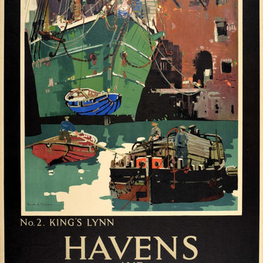 Original vintage London & North Eastern Railway train travel advertising poster - Havens and Harbours on the LNER No. 2. Kings Lynn - featuring artwork by the English artist and poster designer Frank Mason (Frank Henry Algernon Mason; 1875-1965) showing boats in a harbour with a ship moored on the river dock by a warehouse building, a man in a rowing boat and people in a tug boat in the foreground with the title and information text - Full information from L.N.E.R. offices and agencies - on the black border below. The historic port of Kings Lynn in Norfolk connects the North Sea and The Wash on the River Great Ouse and has been an important trade link since the 13th century (now run by the ABP Associated British Ports); the railways were built from the mid 19th century. Printed by Vincent, Day and Sons Ltd, London. Good condition, restored tears, small restored paper losses in margins, staining, backed on linen.
