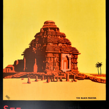 Original antique railway poster for Konarak See India Bengal Nagpur Railway featuring stunning artwork of The Black Pagoda with ruins in the foreground and palm trees on the side set against a yellow background, the bold lettering in red on the black border above and below. Located on the coast by the Bay of Bengal near Puri in Odisha India, Konark is home to the historic 13th century Sun Temple / The Black Pagoda dedicated to the Hindu God Surya; carved from black granite stone, the temple is a major pilgrimage site and was declared a UNESCO world heritage site in 1984. Founded in 1887, the Bengal Nagpur Railway served the eastern and central India train routes until 1952 when it merged with the East Indian Railway Company to form the Eastern Railway. Very good condition, minor creasing, backed on linen, linen trimmed to margins of the poster.