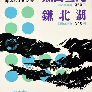 Original vintage travel poster for Kuroyama's Three Waterfalls - Medaki Falls, Odaki Falls and Tengu Taki - featuring the mountain range with gorges, valleys and trees in black over green and blue dots with the text advertising walks and hiking trails, lakes and hot springs in the mountains served by the Tojo Line and Seibu Electric Railway. Good condition, repaired tears, staining, backed on linen.