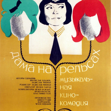 Original vintage movie poster for a Russian film Lady on the Railway Tracks (Дама на рельсах) featuring an image of a lady wearing a smart uniform looking at two wigs on a stand against an orange background with the stylised text below in black and white letters. Good condition, staple holes and minor tears.