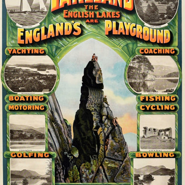 Original antique London & North Western Railway travel poster - Lakeland The English Lakes are England's Playground - featuring black and white image of scenic views and the activities on offer in the Lake District including sailing and historic villages, ancient ruins and hills in Windermere Keswick Ambleside Coniston Kendal Grasmere Ullswater with the bold headings - Yachting Coaching Boating Motoring Fishing Cycling Golfing Bowling Rock Climbing - and central image of people at the top of Napes Needle Scafell against a decorative green background and information below in French - Vacances en Angleterre. The LNWR London & North Western Railway operated train services from 1846 until 1922 when it became part of the LMS London Midland and Scottish railway. Designed by Petty and Sons Ltd, Whitehall Printeries, Leeds. Printed by Johnson and Sons in Windermere. Good condition, restored tears, restored paper losses, minor staining, backed on linen.