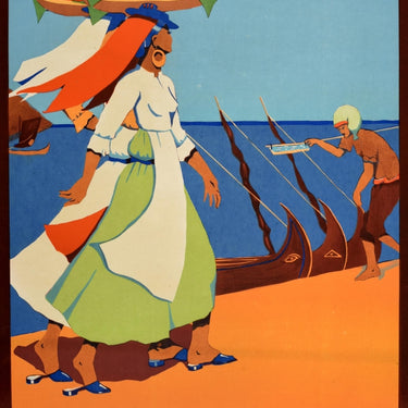 Original antique train travel poster - Chemins de Fer Portugais Lisbonne Son Soleil / Portuguese Railways Lisbon Her Sun - featuring colourful artwork of ladies carrying fish on trays on their heads, walking across a sandy beach towards a fisherman by boats moored on the shore with a view to a boat sailing on the blue sea in the background, the bold title text on the margin above and below. Printed by Lucien Serre in Paris. Good condition, restored tears, small restored paper losses on edges, minor staining, backed on linen.