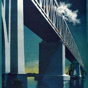 Original vintage travel poster - A link between Great Britain and Scandinavia The Little Belt Bridge Danish State Railways - featuring a great design by Aage Rasmussen (1913-1975) depicting a night view of the bridge with a sailing boat on the calm water below and the light behind hills in the distance reflecting on the river as a steam train crosses the bridge above. Opened in 1935 the Little Belt Bridge / Lillebæltsbroen truss bridge over the Little Belt strait in Denmark connects Snoghøj Jutland Peninsula to Middelfart Funen Island. The Danish State Railway DSB Danske Statsbaner was founded in 1885. Very good condition, small restored tears, backed on linen.