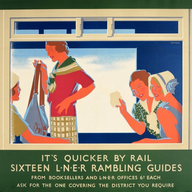 Original vintage travel advertising poster published by the London and North Eastern Railway - It's Quicker by Rail Sixteen LNER Rambling Guides - featuring a great design by Tom Purvis (1888-1959) depicting a view into a train carriage with two smiling young ladies in summer dresses and hats looking out of the window whilst another lady holds a backpack standing next to another member of their walking group, the title below with the information text - From booksellers and LNER Office 6d each Ask for the one covering the district you require. Printed by Jarrold and Sons Ltd, Norwich and London. Horizontal. Large size. Good condition, restored tears, small restored paper losses, restored folds, backed on linen.