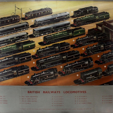 Original vintage quad royal format lithograph poster for British Rail Locomotives. Image depicting a view looking down on 21 different types of British Railways trains lined up on tracks outside a motive power depot, including standard class steam locomotives, two electric locomotives, Fell diesel and gas turbine locomotives and 0-6-0 diesel shunter (later known as the Class 08). Each class is identified by a number with a legend below and the text 15" x 20" copies of this poster can be obtained price 5/- (including Purchase Tax) from the Publicity Officer, British Transport Commission 222 Marylebone Road, London, N.W.1. Published by the British Transport Commission. Printed in Great Britain by J Weiner. Ltd., London, W.3. Horizontal. Very good condition, folded as issued, small holes on fold lines.