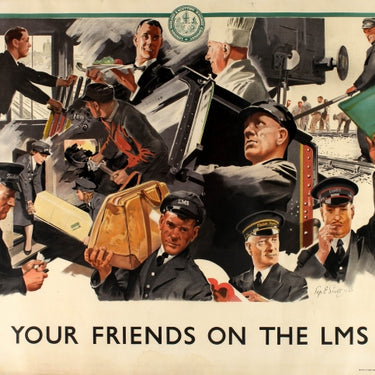 Original vintage travel advertising poster for the London Midland and Scottish Railway – Your Friends on the LMS featuring a great composite image by the British artist Sep. E. Scott (Septimus Edwin Scott; 1879-1965) featuring all the different workers and roles occupied by the LMS train staff and crew, including conductor, ticket controller, signal and switch man, track layers, station medic, guard, chef, waiter and porters against a white background with the text below in stylised black letters. Printed in Great Britain by Jordison & Co., Ltd, London. Horizontal. Large size. Good condition, light staining on margins, backed on linen.