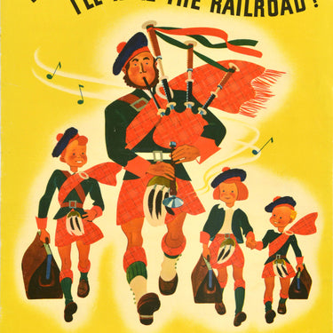 Original vintage travel advertising poster - You take the highroad I'll take the railroad! 2c a mile air conditioned trains Southern Pacific - featuring a fun and colourful illustration depicting a Scotsman playing the bagpipes with music notes on the yellow background and three happy smiling children carrying bags behind him, all dressed in traditional Scottish tartan kilts, jackets, and tam o'shanter bonnet hats with the text above and below. Good condition, creasing, tears, ink stamps, backed on cloth, sticker stuck between poster and cloth on top edge, Oakland public library ink stamp on reverse.