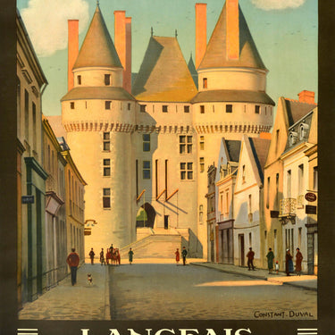 Original vintage French Railways train travel advertising poster for the Loire Valley castles and motor car tours - Chemins de Fer de Paris a Orleans Langeais Les Chateaux de la Loire Circuits Automobiles - featuring a stunning design by Constant Duval (1877-1956) showing people and a horse and cart on the cobble stone street leading to a view of the drawbridge entrance to the historic 15th century Chateau de Langeais with birds flying in the sky, the text on the margin above and below. Originally founded in the 10th century and later rebuilt in a medieval Gothic architecture style, the Chateau de Langeais castle is located on the river Roumer (a tributary of the Loire river). Printed by Lucien Serre, Paris. Very good condition, small restored tears, backed on linen.
