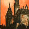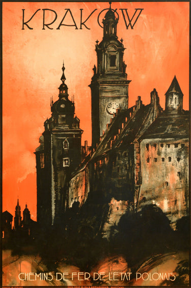 Original vintage train travel poster for Krakow Chemins de Fer de l'Etat Polonais / Polish State Railways featuring a stunning design by the Polish painter and poster artist Stefan Norblin (1892-1952) depicting the historic 11th century Wawel Cathedral / Katedra Wawelska, part of the Castle Complex, in shades of brown and black with its clock tower dominating the view on a dramatic orange shaded sky background. Printed by Zakl. Graf. E. i Dr. K. Kozianskich, Warsaw. Good condition, restored tears, restored paper losses, backed on linen.