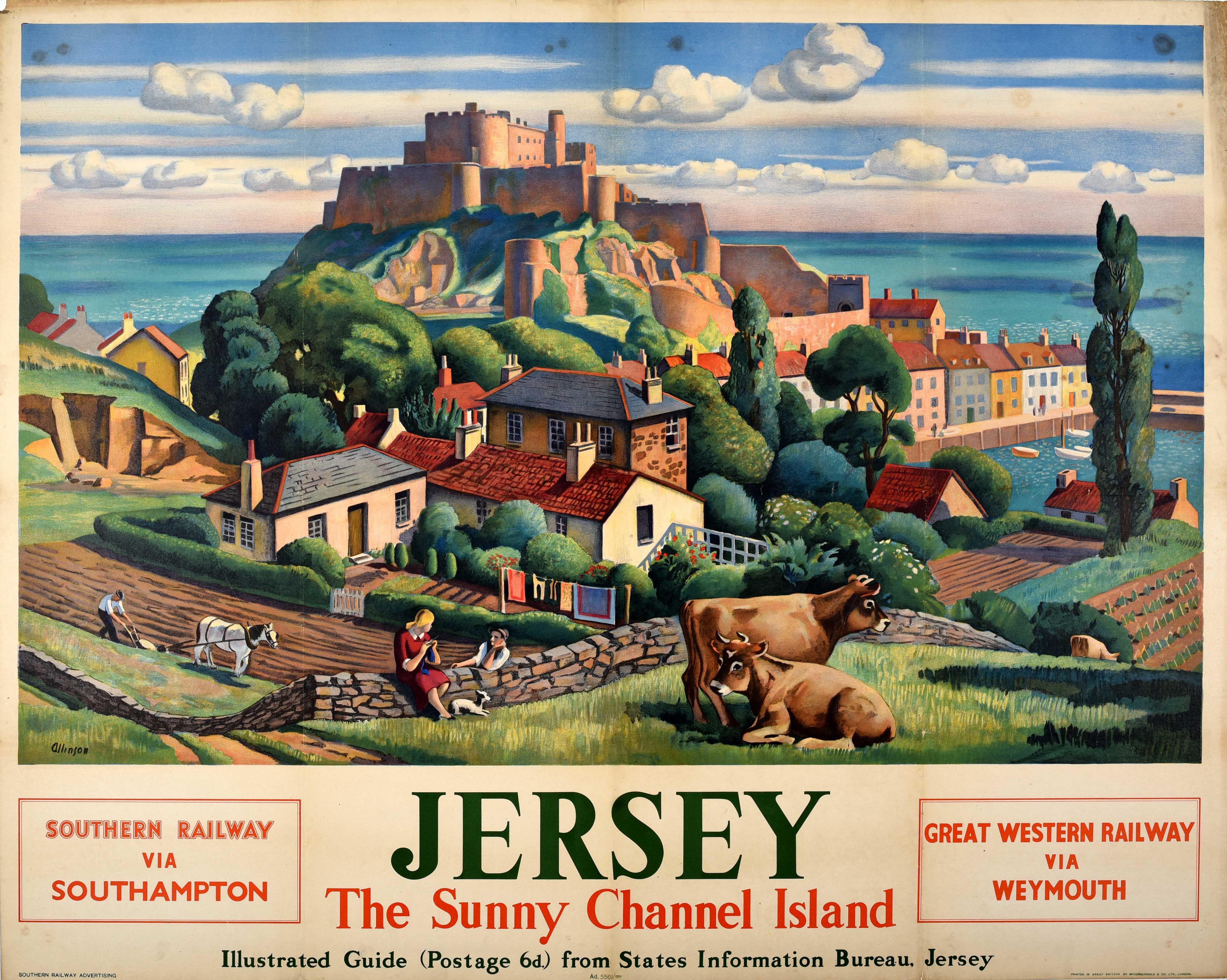 Original vintage travel poster advertising trips to Jersey The Sunny Channel Island on Southern Railway via Southampton and Great Western Railway via Weymouth, featuring a a vibrant, painterly scene by Adrian Allinson (1890-1959) depicting a picturesque coastal village with quaint stone cottages and red-tiled roofs nestled amid lush green hills overlooking the sea. In the foreground, farmers and grazing cows evoke a sense of pastoral calm, while in the background, Mont Orgueil Castle dominates the landscape atop a rocky hill. Brightly painted seaside houses line the shore below, leading the viewer’s eye toward the blue waters and expansive sky filled with soft, rolling clouds. Published by Southern Railway Advertising. Printed in Great Britain by McCorquodale & Co., London. Horizontal. Good condition, restored folds, restored tears, restored paper losses, restored folds, creasing, staining, backed on linen.