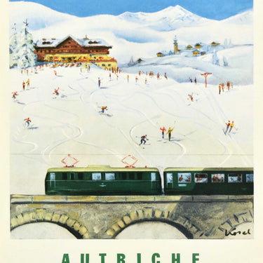Original vintage winter sport and ski travel poster - Autriche OBB Chemins de Fer Federaux Autrichiens / Austria OBB Austrian Federal Railways - featuring skiers on a snowy hill skiing down and taking a drag lift up on the side in front of a snow topped building with trees and a village in the distance and mountain peaks on the horizon, a train crossing an arched bridge in the foreground and the text and rail logo below. Very good condition, light folds.