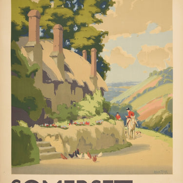 Original vintage GWR Great Western Railway poster for Somerset featuring a scenic countryside view by Herbert Alker Tripp (1883-1954) of trees behind and flowers on the grass in front a traditional thatched cottage with a fox hunter wearing a smart red jacket and leaning back to another horse rider behind him, walking around the corner with their dogs along a path next to a hill leading into the distance with chickens in front of the house in the foreground and the information text with the GWR logo below - Somerset England Travel information etc., from associated British & Irish Railways Inc, 16 West 49th Street, 9 Rockefeller Plaza, New York City. The English artist Sir Herbert Alker Tripp CBE (Alker Tripp; 1883-1954) was a police officer who was appointed an Assistant Commissioner of the London Metropolitan Police (1932-1947); his paintings were exhibited at the Royal Academy and many were used for posters. Lithograph printed by Dangerfield Printing Co. Ltd., London. Very good condition, restored tears and minor loss on margins, backed on linen.