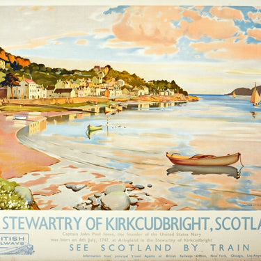 Original vintage British Railways poster - The Stewartry of Kirkcudbright Scotland - featuring a peaceful scenic view by Charles Oppenheimer (1875-1961) of the Solway Riviera coastal village of Kippford in South West Scotland with wooden boats moored on the sandy beach and sailing boats in full sail on the River Urr in front of hills in the distance, the clouds reflected on the calm water of the estuary with the title text, image of a train and caption below - Captain Paul Jones the founder of the United States Navy was born on 6 July 1747 at Arbigland in the Stewartry of Kirkcudbright / See Scotland By Train information from principal travel agents or British Railways offices New York Chicago Los Angeles or Toronto. Horizontal. Large size. Good condition, restored tears on margins, restored paper losses on margins, staining, foxing, backed on linen.