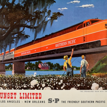 Original vintage Southern Pacific railroad poster featuring a colourful image of The Streamlined Train With The Southern Accent crossing a railway bridge over a river against the clear blue sky with two men in the foreground, one waving to the driver in the modern sleek streamliner train, the Southern Pacific Lines logo at the front of the train and the information text below reading: The New Sunset Limited New Orleans - Los Angeles S.P The friendly Southern Pacific. Introduced in 1894 by Southern Pacific (SP; 1865-1996) to service the passenger route between New Orleans and Los Angeles, Sunset Limited is the oldest named train in America (owned by Amtrak since 1971); the luxury train was streamlined in 1950. Horizontal. Good condition, restored crease marks on image, restored tears, restored paper losses on edges, backed on linen.