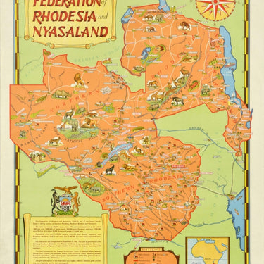 Original vintage poster - The Federation of Rhodesia and Nyasaland - featuring a pictorial map of the region depicting the tribes and wild animals, cattle, industrial manufacturing, forestry, tea, cotton, maize and tobacco plantations, mining, airports, roads, railways, rivers, trees, lakes and territorial boundaries with Mozambique, Angola and the Belgian Congo, a compass point and the bold stylised title text above, and a small map showing the area in Africa with a reference box and information below the coat of arms (a leopard and antelope holding a shield with a rising sun, red lion and black and white wavy lines on it, an eagle at the top and grass at the bottom). The Federation of Rhodesia and Nyasaland (1953-1963) was also known as the Central African Federation CAF comprising Southern Rhodesia, Northern Rhodesia and Nyasaland (now Zimbabwe, Zambia and Malawi). Compiled and published by the Federal Information Department. Designed and printed by the Federal Department of Printing and Stationery Salisbury 1955. Reprinted 1959. Good condition, creasing, tears, staining.