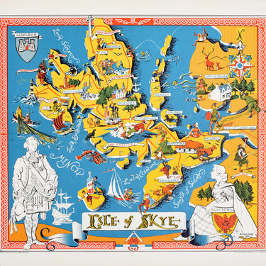 Original vintage pictorial map poster for the Isle of Skye featuring detailed fun and colourful illustrations with a railway and route map on the islands and places marked on scrolls, people fishing, sailing, weaving, a farmer milking a cow, a musician playing the bagpipes and man dancing in traditional tartan kilts, people swimming, climbing mountains, camping and hiking, farming, various animals including sheep, deer and Highland cows, seals and a lobster, mermaids and an octopus, tourists enjoying their holidays, boats, a lighthouse, Celtic cross, food and drink, fishermen, boats and Viking ships at sea, a Scottish flag on a castle and the date 1580 on crossed swords at the site of the historic Battle of Trumpan and the coat of arms for the two dominant Scottish clans on the Isle of Skye at that time - MacLeod and MacDonald - represented by the bull's head crest and motto Hold Fast of MacLeod by Loch Snizort above, and the eagle and ship crest of MacDonald held by the outline of a lady next to the Sound of Sleat below, the outline of a man and a sailing ship on the side, an ornate compass and an artist painting the decorative title lettering with two seahorses below. The Isle of Skye is located off the west coast of Scotland in the Inner Hebrides. Good condition, restored folds, backed on linen.