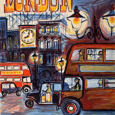 Original vintage travel poster issued by Air Ceylon - Fly the Sapphire Service to London - featuring artwork by Mart Kempers (1924-1993) depicting a busy London city street scene with a delivery van, a taxi laden with tourist luggage and passengers sitting on an iconic red double decker bus in the foreground, lit up the glowing street lights with a clock on the buildings in the background, a plane flying by the bold title text in the night sky above and the Air Ceylon logo below. Founded in 1947 Air Ceylon was the national flag carrier until 1979; it was replaced by by Air Lanka (now Sri Lankan Airlines). Printed in the Netherlands by Kuhn En Zoon, Rotterdam. Good condition, restored tears, restored creasing, backed on linen.