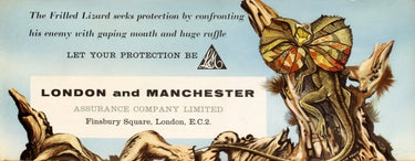 Original vintage advertising poster for the London and Manchester Assurance Company "Let your protection be" one of a series of posters describing the various ways animals protect themselves in nature against predators, implying that its insurance policies are the natural protection for modern life today. Great artwork featuring a frilled lizard (aka frilled-necked lizard mainly found in Australia and New Guinea) on a dried desert tree branch showing an open mouth with its neck ruff spread open, the text on the side with the L&M logo: The Frilled Lizard seeks protection by confronting his enemy with gaping mouth and huge ruffle. 16 Finsbury Circus London EC2. Founded in 1869, the London & Manchester Assurance Company was acquired by Friends Provident (renamed Friends Life) in 1998, which was taken over by Aviva in 2015. Horizontal. Very good condition, folds, faint creases.