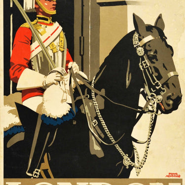 Original vintage travel poster advertising London Heart of the Empire issued by GWR Great Western Railway featuring a great design by the notable British poster artist Frank Newbould (1887-1951) of a Royal Guard on a horse with the text and logo on the margin below. Printed for display at Paddington station by Lowe and Brydone Printers Ltd. Fair condition, several restored paper losses, several restored tears, staining, browning, backed on linen.