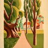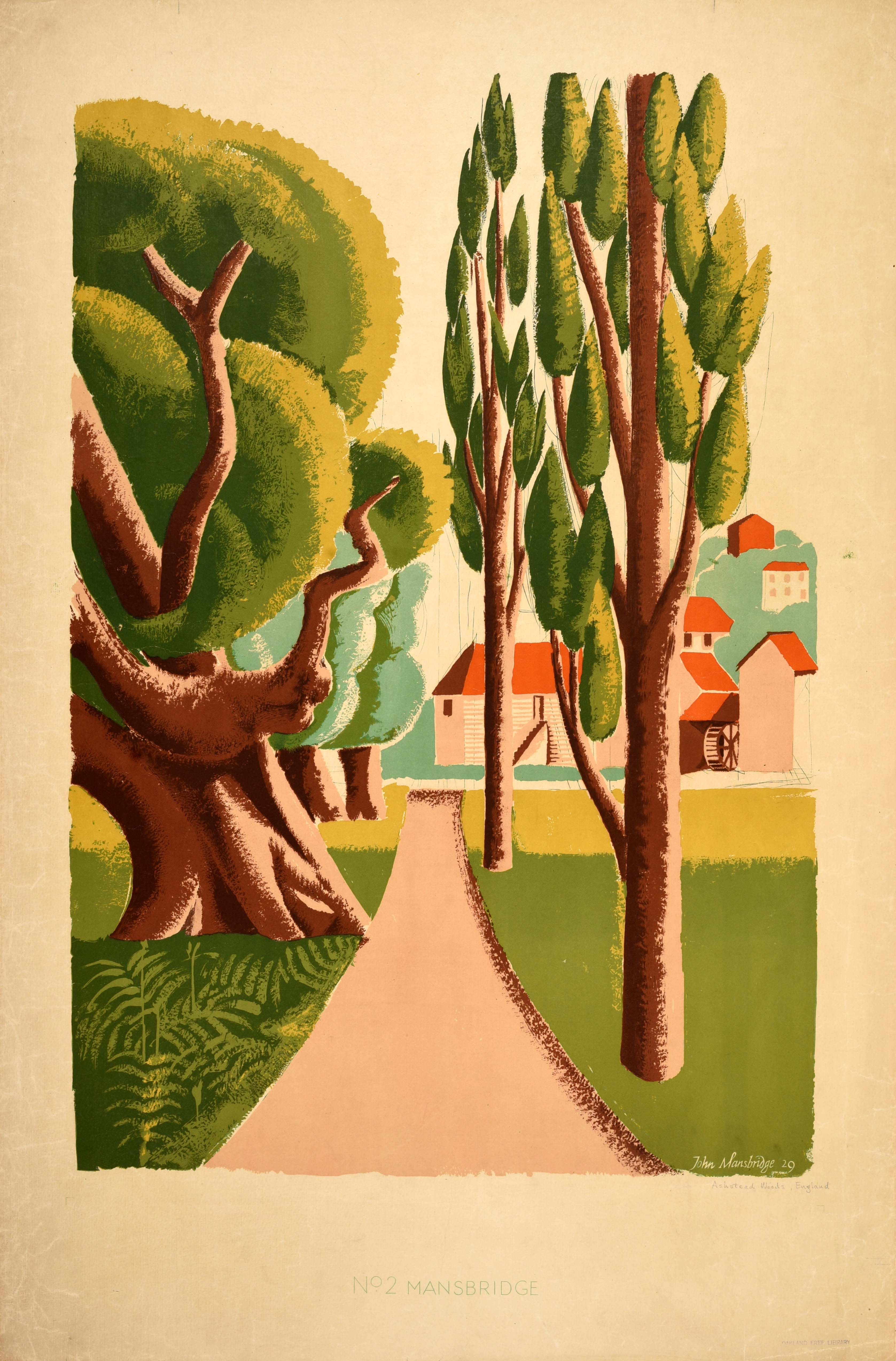 Original vintage London travel advertising poster for Ashtead Woods featuring artwork by John Mansbridge (1901-1981) depicting a tree-lined pathway leading towards a village including a building with a water wheel. Blank banner below with placeholder text reading - No 2 Mansbridge. Ashstead Woods England written in pencil. Ashtead is a village in the Mole Valley district of Surrey, just south of London. Good condition, restored tears, creasing, small restored paper losses, staining, ink stamps, writing in pencil, backed on linen.