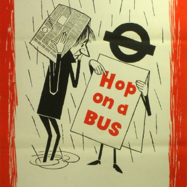 Original vintage advertising poster featuring a fun image of a sandwich style billboard with a London Transport logo pointing to a message on it - Hop on a Bus - to a man shielding under a newspaper in the rain. One of a series of posters promoting London's convenient bus service. Printed by Leonard Ripley & Co Ltd. Excellent condition.