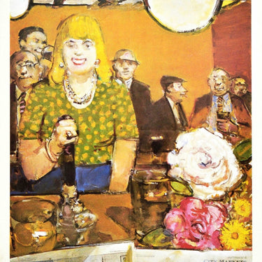 Original vintage London Underground poster for the Art on the Underground series - Art At The Royal Academy nearest stations Green Park, Piccadilly Circus - featuring a pub landlady pulling a pint of beer with customers in the background and flowers in the foreground viewed from a person reading a newspaper with a drink on the side. Artwork by the British painter Ruskin Spear (1911-1990) entitled The Barmaid. Commissioned by the Royal Academy and London Underground. Very good condition, light creasing, light folds.