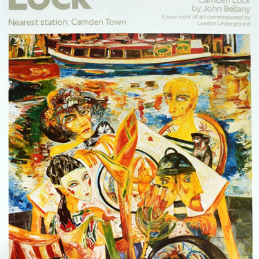 Original vintage London Underground poster for Camden Lock nearest station Camden Town. Colourful illustration depicting people enjoying a lobster meal at a table with canal boats on the water. Art on the Underground - Camden Lock by John Bellany a new work of art commissioned by London Underground. Large size. Excellent condition.