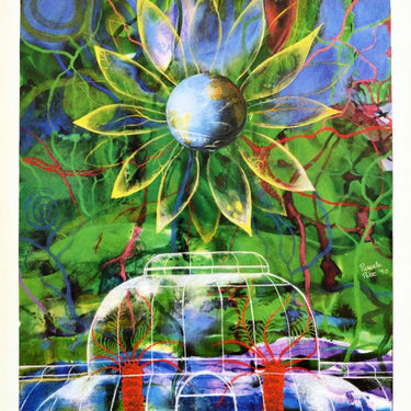 Original vintage London Underground poster - Gardens of earthly delight by Tube The new Palm House Kew Nearest station: Kew Gardens - featuring colourful artwork depicting a globe of the world in the centre of a tropical flower surrounded by petals against a green leaf background with an outline of the Palm House in white below. The Force that Through the Green Fuse... by Pascale Petit a new work of art commissioned by London Underground. Art on the Underground. The artist Pascale Petit (b.1953) is an award winning poet who trained as a sculptor. Excellent condition.