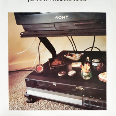 Original vintage London Underground poster featuring a photograph of a Sony television and ornaments on a VHS video recorder below it with the text reading: I think we are very lucky to have informed taste - with my position as a fine arts valuer. Art on the Underground photography Martin Parr Signs of the Times BBC 2. The London Underground logo in colour on the side. Excellent condition.