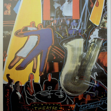 Original vintage London Underground poster: Paint the Town by Tube - Leicester Square, Piccadilly Circus. Colourful image of the night life of London's central entertainment area - people dancing, jazz saxophone player and music notes, cinema and theatre, food and drink. Artwork by Donna Muir and Su Huntley. Very good condition, bumps on one corner.