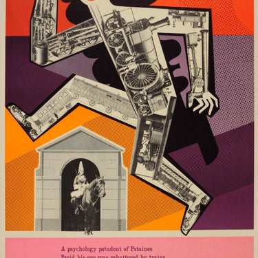 Original vintage travel advertising poster for the London Underground by the notable graphic designer Frederic Henri Kay Henrion (1914-1990) featuring a surreal modernist collage of trains and engines inside the outline of a leaping figure off to see the Changing of the Guard at Buckingham Palace with the London Transport roundel logo as its mouth and a train as its shadow against the colourful background, a black and white photograph of a royal guard on a horse below and the text reading: A psychology pstudent of Pstaines Psaid his ego was pshattered by trains Pso he took it to see The pceremony Of the Changing of the Guard which takes place every morning at the Horse Guards and on most mornings at Buckingham Palace or St James's. All the details are contained in a leaflet, obtainable free from the Publicity Officer, London Transport, 55 Broadway, S.W.1. Printed by John Swain and son. Good condition, restored tape marks on corners, very minor scuff marks, backed on linen.