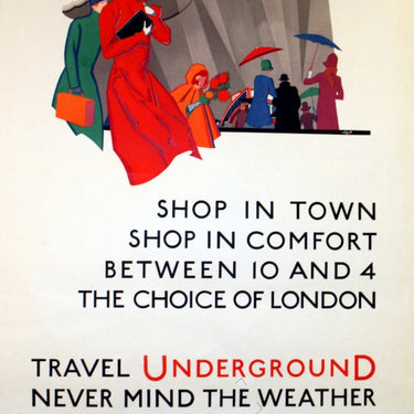 Original vintage advertising poster for the London Underground: Shop in Town, Shop in Comfort, Between 10 and 4, The Choice of London - Travel Underground, Never Mind The Weather. Stylish Art Deco image featuring fashionably dressed people wearing bright clothes, hats and raincoats holding bags and umbrellas as they approach a stormy grey sky with the text forming the shape of an ascending Tube escalator, designed by Leith. Published by Underground Electric Railway Company Ltd, printed by The Baynard Press. Good condition, fold top left corner.