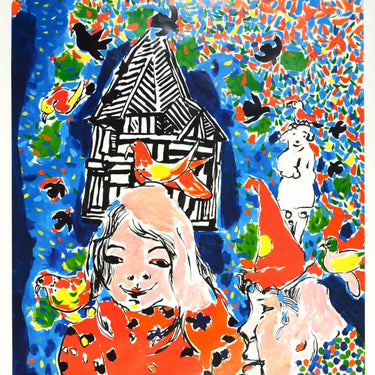 Original vintage London Underground poster for Soho. By day, by night, by Tube nearest stations Tottenham Court Road, Piccadilly Circus or Leicester Square. Colourful image of a lady with other people, birds and flowers in the background. Soho Square by Philip Sutton one of a series commissioned by London Underground. Large size. Excellent condition.