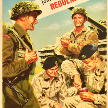 Original vintage British Army recruitment poster - Join the Regular Army - featuring great artwork showing smiling soldiers in military uniform socialising in front of a tank while cooking and making a meal out of tinned food, two of the men wearing camouflage helmets and one carrying a rifle gun over his shoulder, and two in black berets with the skull and crossbones insignia of the Lancer regiment on the caps, the text diagonally over the image above. Printed for H.M. Stationery Office by Fosh and Cross Ltd, London. Good condition, folds, creasing, tears, staining.
