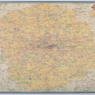 Original vintage travel map poster - London Transport All Routes Road and Rail - featuring a detailed map showing the areas of London served by bus routes, tramways, coach routes, trolleybus, mainline train and London Underground railways and stations highlighted on a yellow background with the surrounding areas in white, the title and key to the travel routes with the iconic London Transport roundel at the top, the parks, reservoirs, docks, rivers and canals as well as golf courses and aerodromes (airports) marked with the various towns and cities covering an area from Bedfordshire, Hertfordshire, Essex, Kent, Sussex, Surrey, Berkshire and Buckinghamshire into Central London and the City of London with a radius line showing the areas within 5, 10, 15, 20, 25, 30, 35 and 40 miles from Charing Cross, the boundary of the Metropolitan Police jurisdiction, the LNER, GWR, SR, LMSR and other railway connections marked in black with the main roads in red. Printed by Waterlow and Sons Limited London, Dunstable and Watford. Horizontal. Large size. Good condition, restored folds, restored tears, backed on linen.