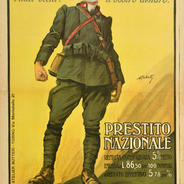 Original antique World War One war bond poster for the National Loan / Prestito Nazionale featuring an image of a Bersaglieri soldier in military uniform standing against a yellow shaded background with a blood stained gauze bandage wrapped around his eyes and head, the text as a quote above reads - .. per la Patria i meie occhi! per la Pace il vostro denaro / .. my eyes for the Fatherland Your money for Peace - and the title and information below reads - National Loan consolidated 5% net annuity issued at L.86.50 per 100 nominal and effective income 5.78 per % Subscriptions are received: at the branches of ordinary credit institutions savings banks cooperative banks firms and banking companies participating in the loan consortium. Printed by Atelier Butteri, Torino. Good condition, folds, creasing, repaired tears, staining, backed on Japanese paper.