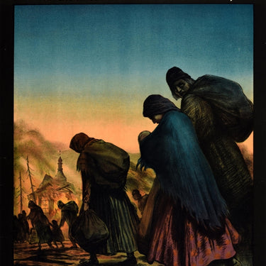 [ON RESERVE 25/11/2023] Original antique World War One fundraising poster for The Polish Victims Relief Fund featuring an image of refugees in ragged clothing holding their belongings, walking through the mud past a fire in a burning church and bare trees, a lady carrying a baby and a man in the foreground looking round to the viewer, the text on the margin above and below - The homeless women and children of Poland are far ... but need they be far from your hearts? Pray help us to help them! 11 Haymarket London SW. Miss Laurence Alma Tadema Hon. Secretary. Printed by Miles and Co, Ltd. Lith Wardour Street. The writer Laurence Alma-Tadema (Laurense Tadema; 1865-1940) was secretary of the Poland And The Polish Victims Relief Fund from 1915-1939. Good condition, large restored tears through image, minor staining, backed on linen.