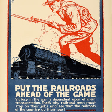 Original antique World War One propaganda poster - Put the Railroads Ahead of the Game - featuring dynamic artwork by Ernest Hamlin Baker (1889-1975) of a soldier in shades of red crouching forward with a bayonet rifle gun over a steam train running at speed below, the bold white text in the blue and red border reading: Put the railroads ahead of the game Victory in the war is dependant upon efficient transportation. That's why railroad men must stay on their jobs and see that the railroads of the country do their part The nation is counting on you. Excellent condition, backed on linen.