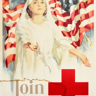 Original antique World War One recruitment poster - Join - issued by the Red Cross featuring artwork by Walter W. Seaton (1895-1957) depicting a medical nurse in a Red Cross uniform holding out her arms pleading for more volunteers in front of a large American flag with the single word text and Red Cross logo below. The American Red Cross ARC was formed in 1881 as non-profit humanitarian organization founded by the American Civil War nurse Clara Barton (Clarissa Harlowe Barton; 1821-1912). Fair condition, staining, restored tears, restored paper losses, backed on linen.