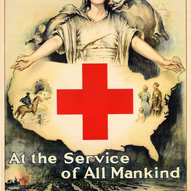 Original antique World War One medical recruitment poster - Annual roll call At the Service of All Mankind - featuring a volunteer nurse with her uniform flowing behind her like angel wings, standing above a map of America with a Red Cross in the centre, a person riding a horse on one side and a wounded soldier on crutches with a lady and child on the other side, the map shape above a disaster scene showing flooding with a damaged bridge and homes in ruins below. The American Red Cross ARC was formed in 1881 as non-profit humanitarian organization founded by the American Civil War nurse Clara Barton (Clarissa Harlowe Barton; 1821-1912). Printed by Edwards and & Deutsch Litho and Co Chicago. Good condition, restored tears, small restored paper loss in margin, staining, foxing, backed on linen.