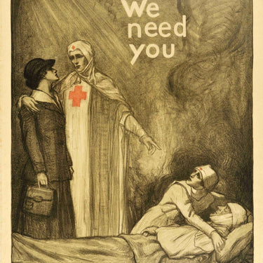 Original antique World War One medical recruitment poster - We Need You - featuring an illustration by Albert Sterner (1863-1946) depicting a Red Cross nurse appealing to a young lady for help with light shining down on her uniform as she points to another nurse tending to a wounded soldier on a bed, his head and arm wrapped in bandages. The American Red Cross ARC was formed in 1881 as non-profit humanitarian organization founded by the American Civil War nurse Clara Barton (Clarissa Harlowe Barton; 1821-1912). Published by American Lithographic Co. NY. Good condition, tears in margins, creasing, foxing, staining, pencil mark in the bottom left corner.