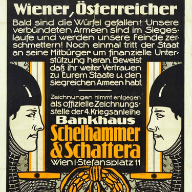 Original antique World War One poster for the 4th War loan from Vienna Austria featuring a great illustration of two soldiers in armour facing each other and holding swords with stylised lettering in orange and white on black between them, a decorative oak leaf and acorn design on the background with a wreath below the text reading: The dice will soon be cast! Our combined Armies are on the March of Victory and will crush our enemies! Once again the State approaches its fellow citizens for financial support. Prove that you continue to have confidence in your state and the victorious armies. Official Subscription Office for the 4th War Loan Bankhaus Schelhammer & Schattera Vienna 1 Stefansplatz 11 / 4. Kriegsanleihe Wiener Osterreicher Bald sind die Wurfel gefallen! Unsere verbundeten Armeen sind im Siegeslaufe und werden unsere Feinde zerschemettern! Noch einmal tritt der Staat an seine Mitburger um finanzielle Unterstutzung heran. Beweist dass ihr weiter Vertrauen zu Eurem Staate u. den siegreichen Armeen habt. Zeichnugen nimmt entgegen als offizielle Zeichnungsstelle der 4. Kriegsanleihe Bankhaus Schelhammer & Schattera Wien 1 Stefansplatz 11. Printed by Paul Gerin, Vienna. Good condition, folds, tears and minor paper loss in image and margins, staining.