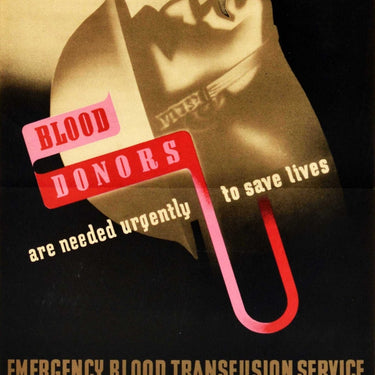 Original vintage World War Two poster - Blood donors are needed urgently to save lives Emergency blood transfusion service - featuring a modernist design by the notable British graphic designer Abram Games (Abraham Gamse; 1914-1996) depicting a dramatic illustration of a soldier wearing a military helmet with his head tilted back, a red and pink shaded curved line as a medical blood drip with the rest of the text diagonally across and in bold lettering below. Issued by the Ministry of Health to encourage people on the home front to donate blood and save lives during the war. Printed for HM Stationery Office by Lowe and Brydone Printers Ltd, London. Good condition, creasing, folds, small tears, pinholes, minor staining.