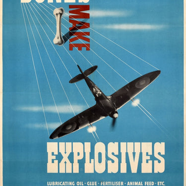 Original vintage World War Two Home Front recycling poster - Bones Make Explosives Put Out All Bones For Salvage - featuring a great modernist graphic design by Reginald Mount (1906-1979) of an RAF Royal Air Force spitfire plane firing its machine guns whilst flying through the blue sky leaving white lines behind it from the bold white word Bones and word Make in red next to an illustration of a bone towards the word Explosives in white, the rest of the list in white - Lubricating Oil Glue Fertiliser Animal Feed Etc. - and text in black below. Printed for HM Stationery Office by Ford, Shapland and Co. Ltd, London. Good condition, restored folds, small restored paper losses, restored tears, minor staining, backed on linen.