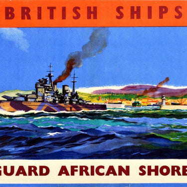 [ON RESERVE] Original vintage World War Two propaganda poster British Ships Guard African Shores - Design features a camouflaged military ship patrolling the shoreline of an African village. Framed by an orange and white banner. Horizontal. Good condition, tears on edges, folds, creasing.