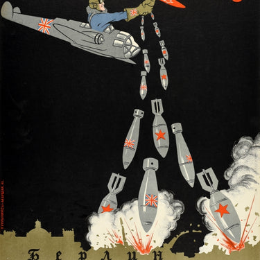 Rare original vintage World War Two poster with a short poem written by the Soviet writer, translator and poet Samuil Marshak (1887-1964): The brotherly nations have appointed a date over the enemy's city At every handshake fascist Germany cracks / Назначили народы-братья над вражьим городом свидание. При каждом их рукопожатьи трещит фашистская германия - below an image of two smiling pilots in British and Soviet war planes shaking hands as they drop bombs on Berlin / Берлин against a black background, the bombs marked with Union Jack flags and red USSR stars over a skyline map of the German city, the poem on a blue banner background. Kukryniksy was the collective name formed from the combined names of three caricaturists - Mikhail Kupriyanov (1903-1991), Porfiri Krylov (1902-1990) and Nikolai Sokolov (1903-2000). Good condition, restored tears, minor staining, backed on linen.