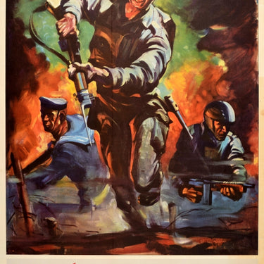 Original vintage World War Two poster - Buy Victory Bonds - featuring a dynamic battle scene with explosions in the background and three men in military uniform armed with guns charging forward over barbed wire, an army soldier in the centre with a sailor and air force pilot behind him, the text in bold red lettering below. Good condition, restored folds, restored tears, small restored paper losses on image, staining, browning, backed on linen.